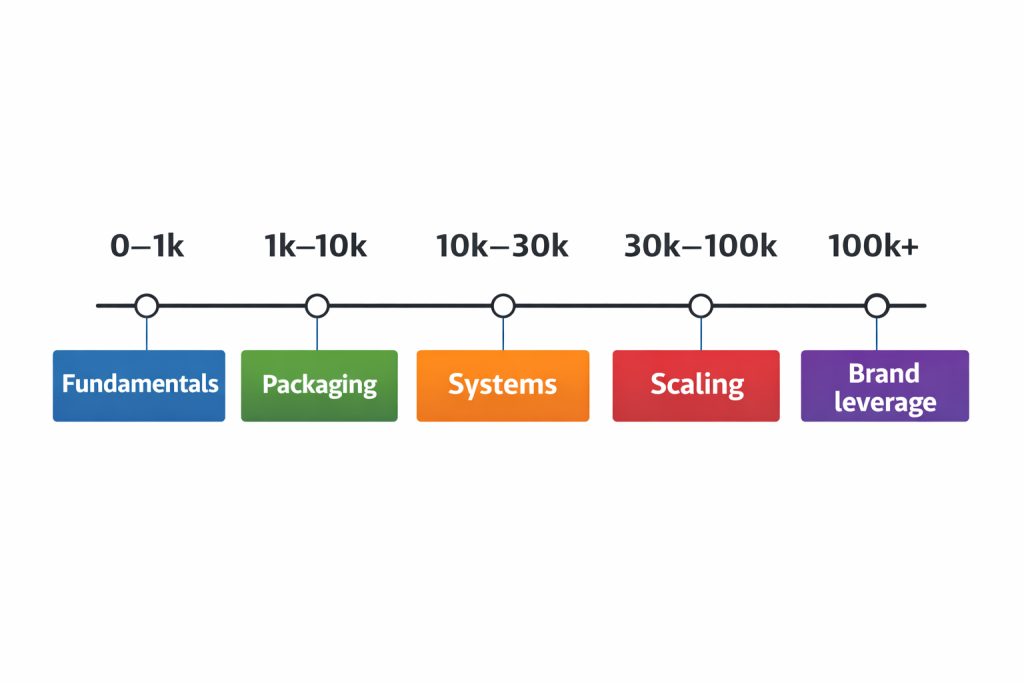 0–1k → Fundamentals 1k–10k → Packaging 10k–30k → Systems 30k–100k → Scaling 100k+ → Brand leverage